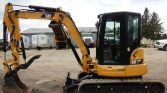 2018 Caterpillar 305E2 CR mini excavator with 627 hours on meter. It has a four-cylinder diesel engine and hydrostatic two-speed travel transmission. The operator’s station is an enclosed cab with AC and heat. Features include operational auxiliary hydraulics, a 78-inch wide backfill blade, boom swing, and a 68-inch stick length. It comes with a hydraulic quick coupler, hydraulic thumb, and a Caterpillar bucket that is 24 inches wide with a bolt-on cutting edge. The tracks are 15.5 inches wide rubber.