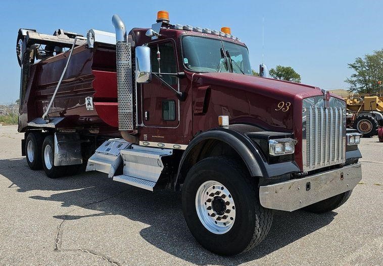 The 2008 Kenworth W900 dump truck has 598,912 miles on the odometer and 27,145 hours on the meter. It is powered by a Cummins diesel engine with a 10.8L displacement and 6 cylinders, paired with a 10-speed Eaton Fuller manual transmission.
